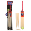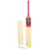 Size 5 cricket set with bat 4 stumps bails and a ball.